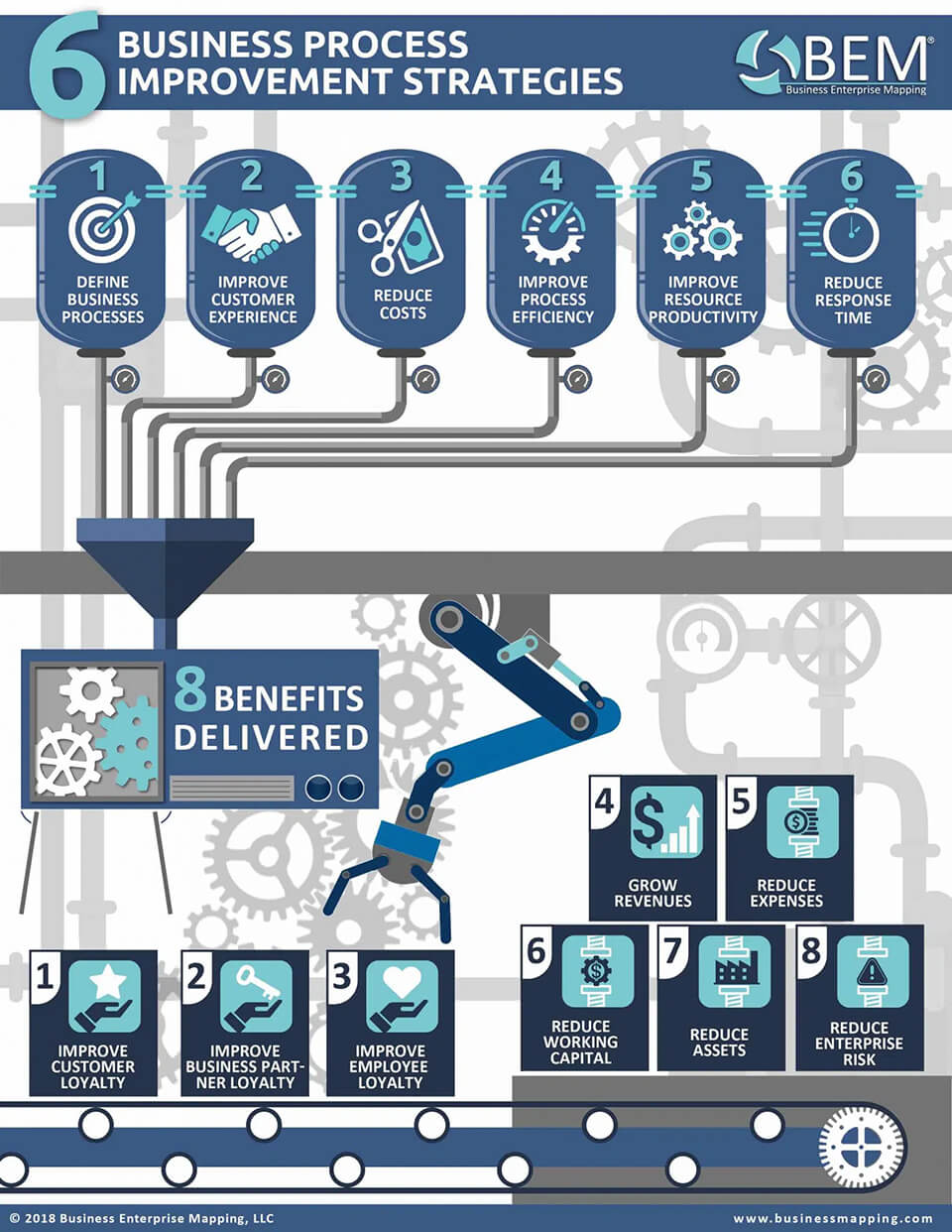 While most organizations value process mapping as a useful business improvement tool, few managers think of process improvement strategies as a primary improvement approach. Process improvement strategies can, in fact, drive very powerful and sustainable business improvement. Defining, improving, deploying and maintaining strong business processes is a very effective method for creating competitive advantage.