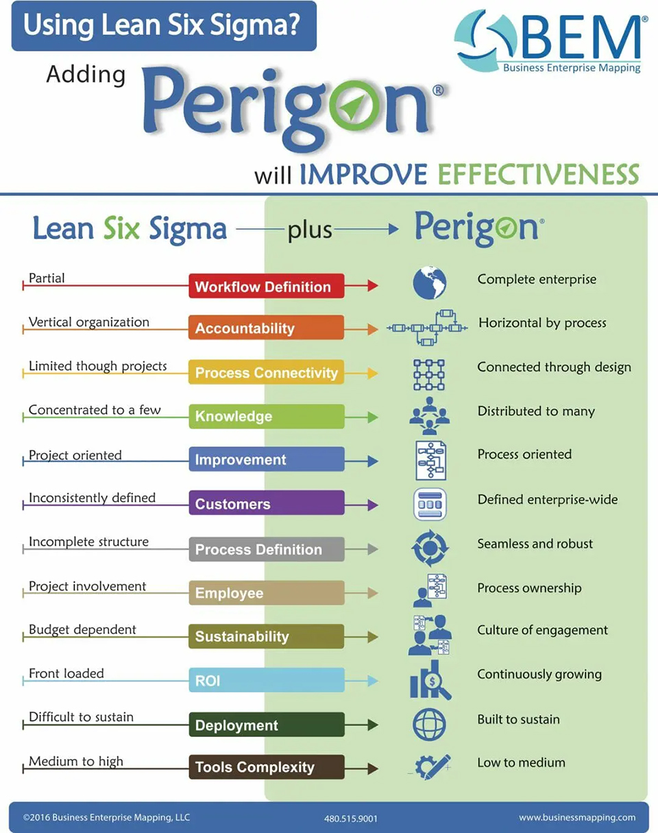 Designed originally for manufacturing improvement, Lean Six Sigma focuses on removing waste and defects using the Define, Measure, Analyze, Improve, and Control (DMAIC) methodology. Business Enterprise Mapping’s Perigon Method uniquely builds upon the LSS toolkit to analyze a larger scale of work definition and connectivity that delivers greater change and overall improvement. As complementary tools, LSS and Perigon together provide a powerful capability to address the most difficult organizational problems through engaging, structured and insightful analysis. Perigon adds a far more robust business process mapping tool that increases the effective application of LSS.