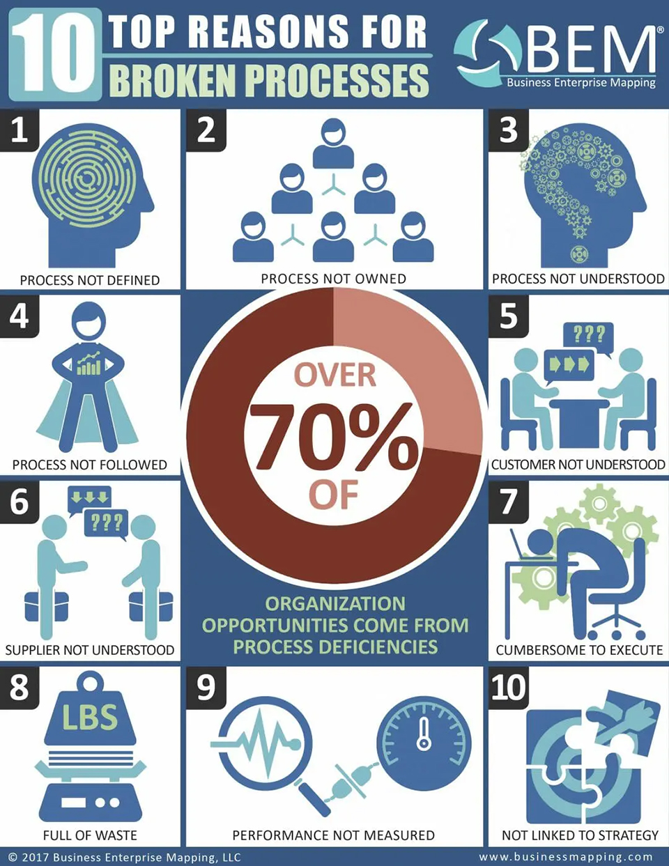 Behind every unhappy customer lies a broken process. On average, about 20% of organization problems and opportunities come directly from disconnects found between process boundaries. Just getting Process Owners to correctly identify their customers can often provide a breakthrough. In addition, suppliers are rarely given guidance on what they must provide a process to be successful. Best practice performance always includes customer/supplier engagement that provides clear boundary specifications.